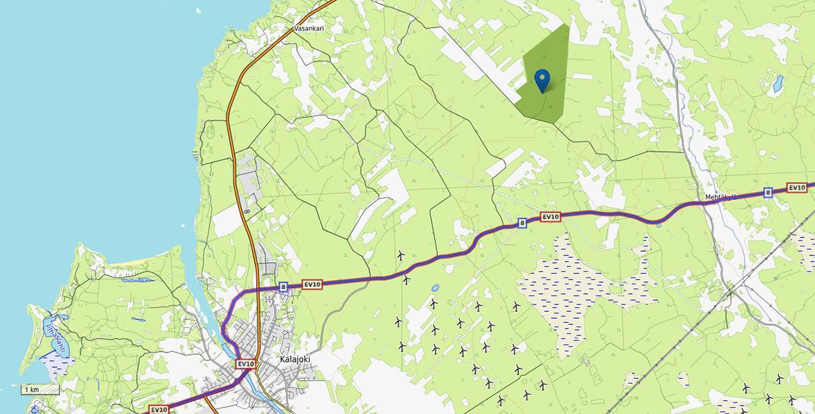 Juurakko wind farm is located in Northern Ostrobothnia, in the municipality of Kalajoki. It is situated around ten kilometres to northeast from the centre of Kalajoki. Juurakko area is about 250 hectares and it is owned by private land owners.
